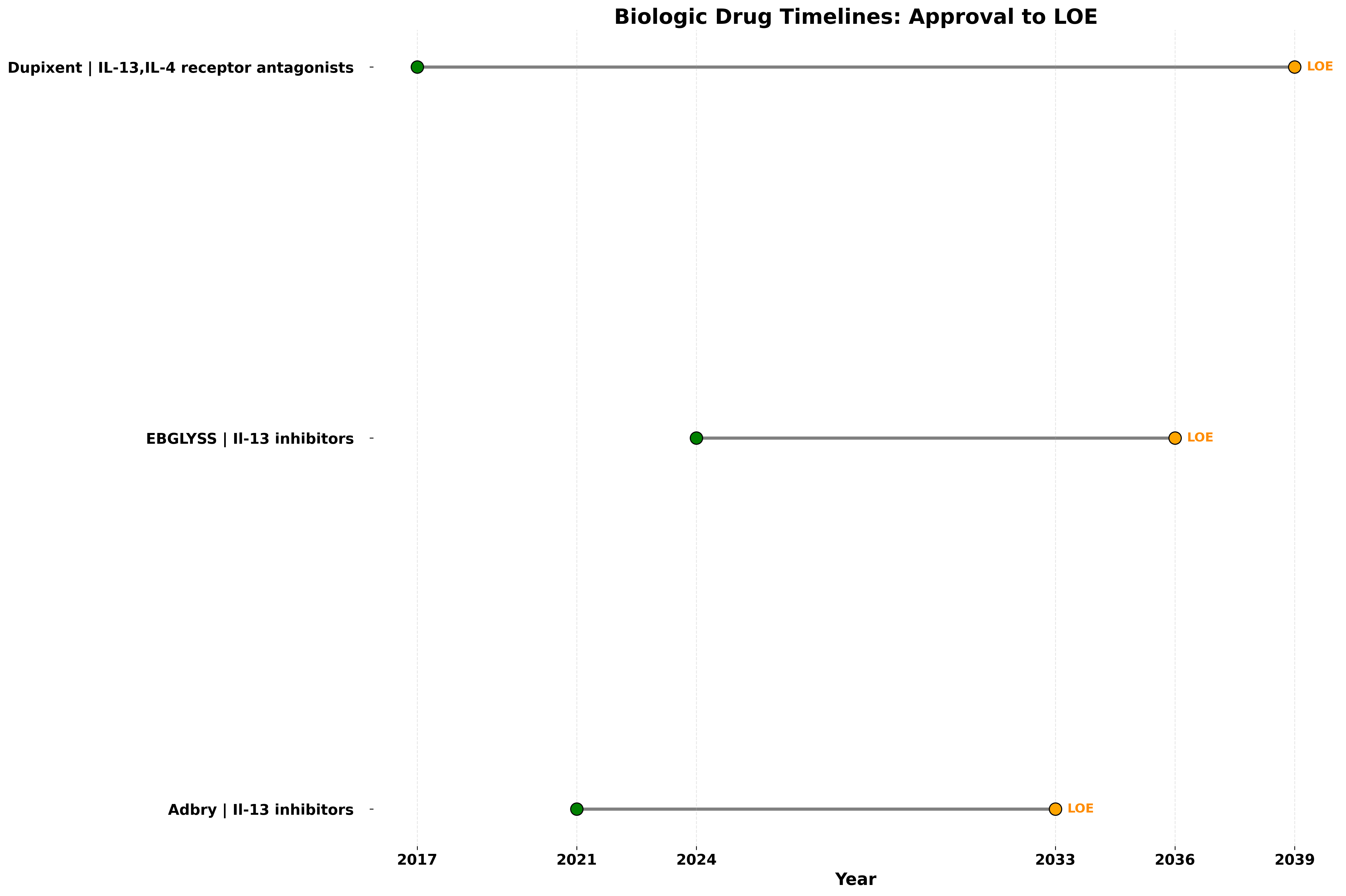 All three target IL-13/IL-4 axis, are administered subcutaneously, and demonstrate comparable efficacy (~23–38% at 16 weeks) across adult and pediatric populations. With patent protection extending into the 2030s, near-term biosimilar risk is minimal
